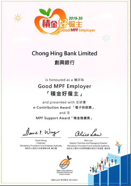 2020年度“积金好雇主”嘉许,并同时获得“电子供款奖”及“积金推广奖”两个特别奖项,以表扬本行为员工提供优质退休保障的承诺及贡献、善用电子方式处理强积金供款及积极向员工提供与管理强积金相关的协助。